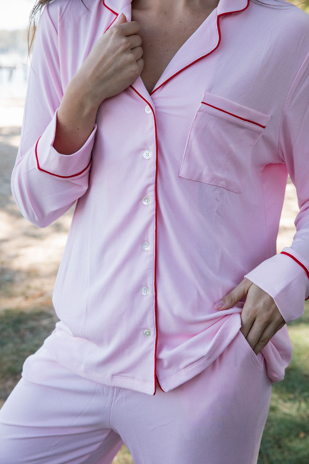 Cozy up in this oversized, long sleeve button up paired with wide leg pants and made in our